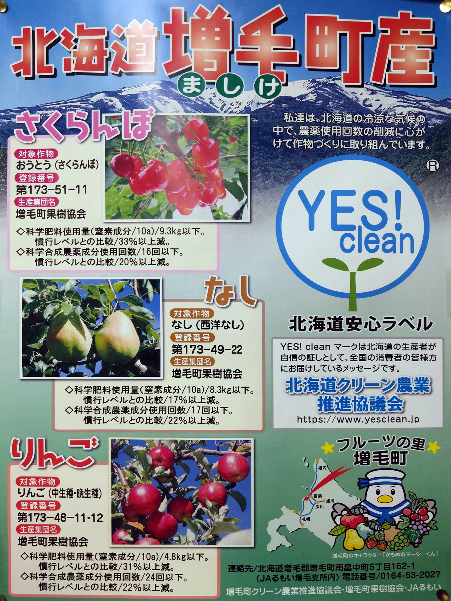 1998年(平成10年)にコンフューザー(性フェロモン剤)の設置を基本技術とした減農薬栽培の試験が始められ、2001年(平成 13 年)に北海道によるYesクリーンの認証を頂き、安心安全の果樹を栽培しています。